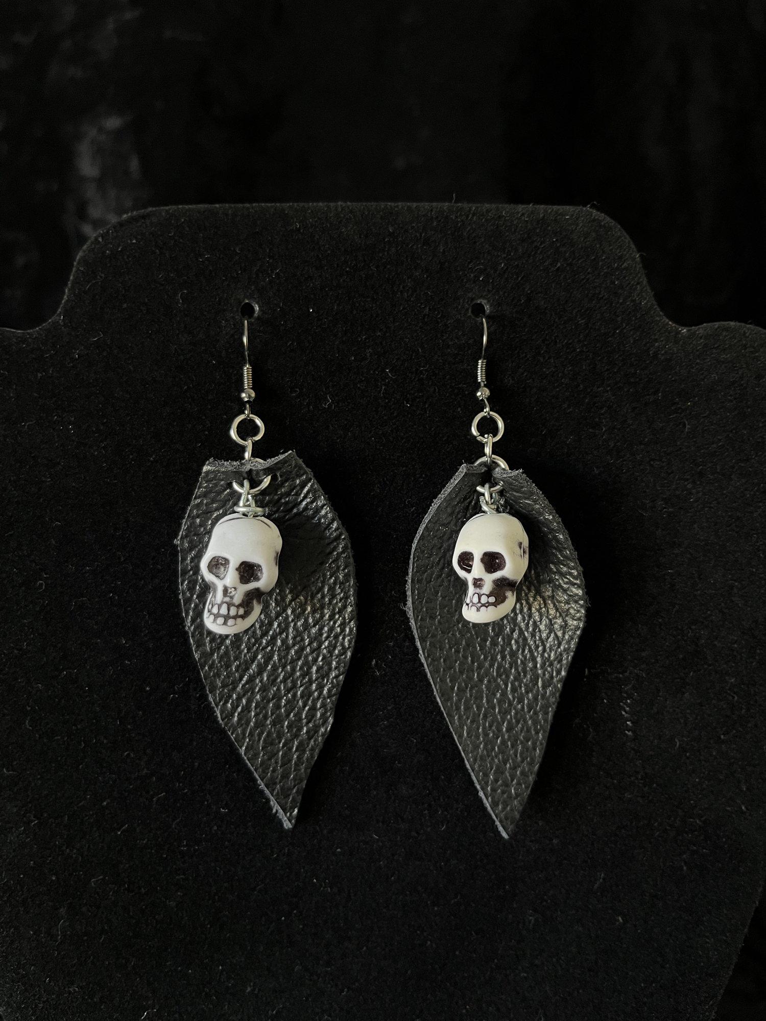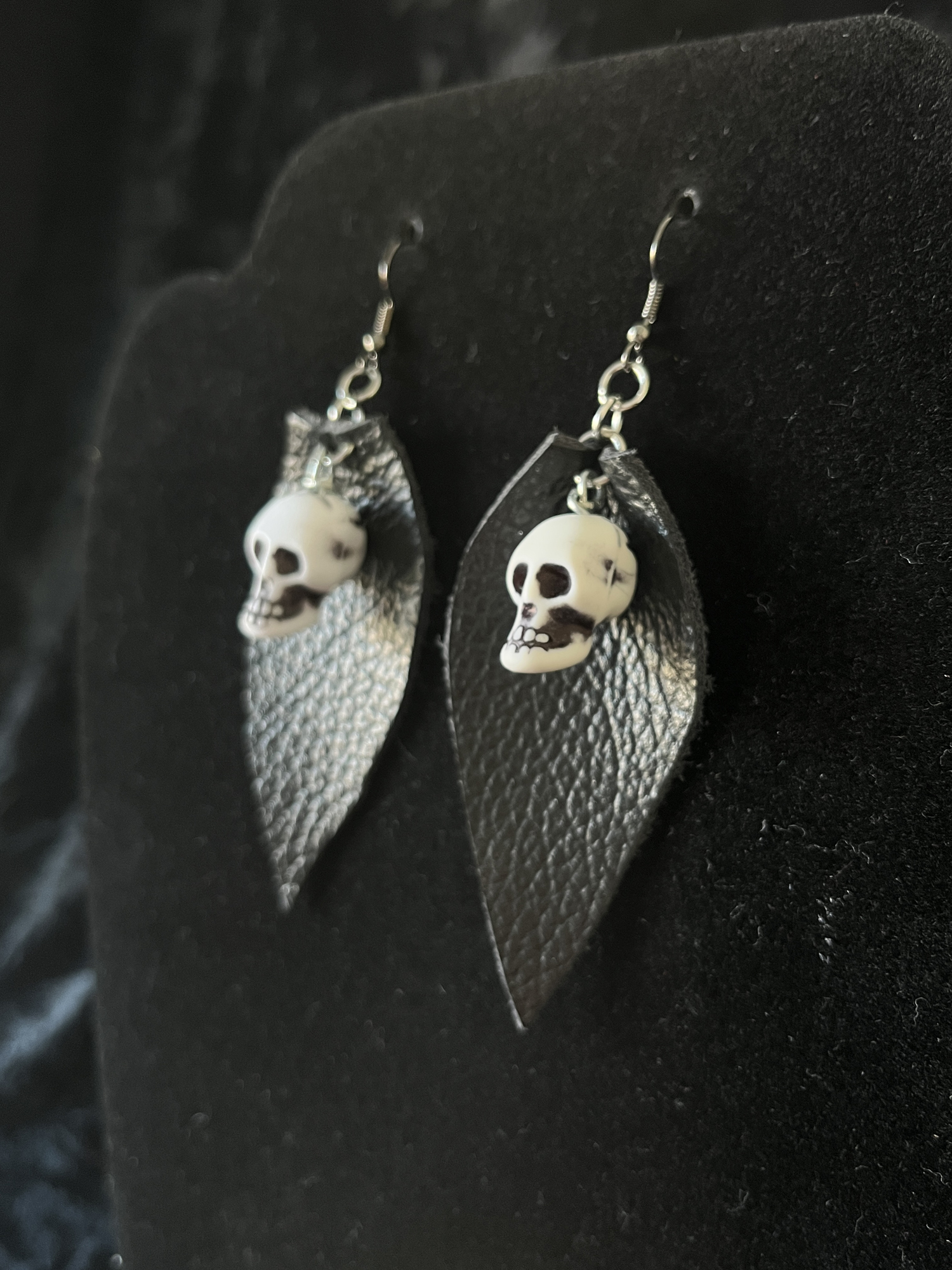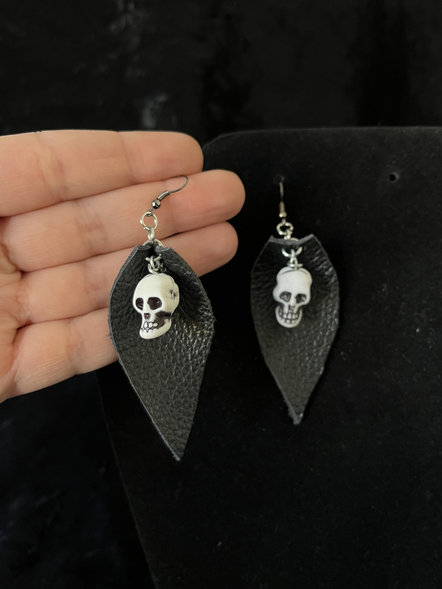 Naušnice skulls su napravljene od kožnih listova i skull perli, lagane su za nositi.